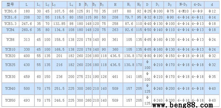 YCB型齒輪泵外形及安裝尺寸的性能參數(shù),是在介質粘度4×10-3m2/s(40cSt)時確定的。YCB型齒輪泵外形及安裝尺寸性能參數(shù)表中給出的參數(shù)值適用于介質粘度1×10-5~8×10-5m2/s(10~80cSt)范圍內,超出這個范圍則根據(jù)用戶提出的性能參數(shù)要求另行確定。
