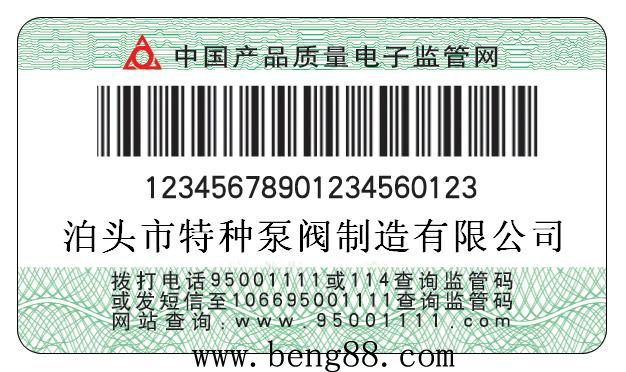 泊頭市特種泵閥制造有限公司自2008年5 月1 日出廠的產(chǎn)品,在產(chǎn)品合格證上粘貼長方形監(jiān)管碼標簽,上有20位數(shù)字,這就是產(chǎn)品監(jiān)管碼。因此,我公司生產(chǎn)的每件產(chǎn)品都將有一個“電子身份證”??梢岳霉潭娫?、手機短信、互聯(lián)網(wǎng)、超市終端等網(wǎng)絡通訊設備對電子監(jiān)管碼進行查詢,辨別真?zhèn)巍2樵冝k法如下: